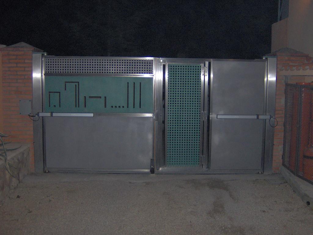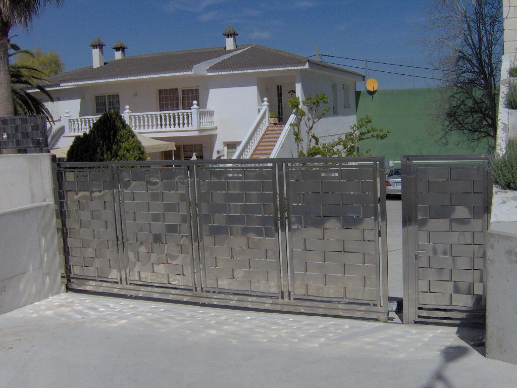 Cancela de doble hoja en acero inoxidable de diseño propio para chalet. |